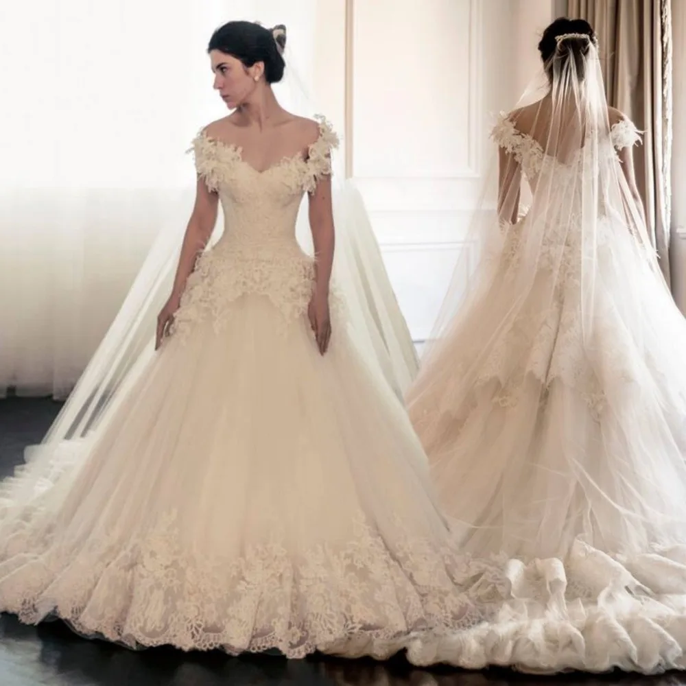 Ivory feather ball gown wedding dresses.